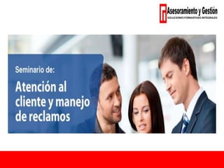 Este documento presenta un curso de Atención al Cliente y Manejo de Reclamos dirigido a telemarketers, vendedores, recepcionistas y personal relacionado con atención al cliente. El curso cubrirá temas como atender clientes difíciles, aspectos humanos en la atención, inteligencia emocional, eficiencia en el manejo de reclamos y beneficios en el manejo de quejas. Se llevará a cabo en Quito y Guayaquil en junio y julio, e incluye participación en el seminario,