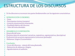 Este documento describe la estructura y tipos de discursos públicos. Explica que los discursos tienen tres partes: introducción, desarrollo y conclusión. Luego detalla cuatro tipos de discursos - ceremonial, comunitario, político y religioso - y sus propósitos respectivos. Finalmente, identifica cuatro tipos de secuencias textuales - descriptiva, explicativa, narrativa y argumentativa - y elementos para estructurar textos argumentativos.