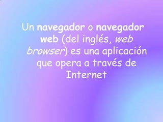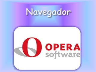 Este documento describe los principales navegadores web, incluyendo Opera, Mozilla Firefox, Internet Explorer, Safari y Google Chrome. Explica sus características, empresas de desarrollo y cuotas de mercado estimadas.
