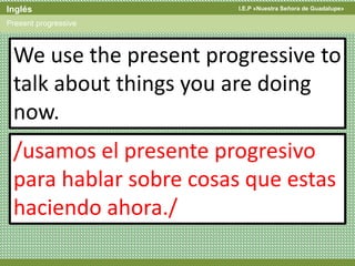 El documento explica el uso del presente progresivo en inglés. Se usa para hablar de acciones que están ocurriendo ahora. Incluye las formas afirmativa, negativa e interrogativa del presente progresivo, con sujetos como yo, ella, ellos y verbos como cantar, comer y cocinar.