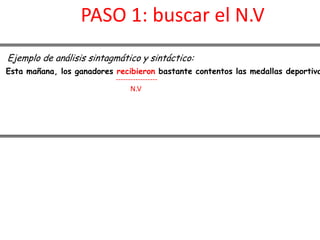 Este documento describe los pasos para realizar un análisis sintáctico de una oración simple. Los pasos incluyen identificar el verbo nuclear, el sujeto, determinar si el verbo es copulativo o no, si es activo o pasivo, y si lleva complementos directos, indirectos, de régimen o circunstanciales. El documento también explica cómo señalar el sintagma verbal/predicado verbal o sintagma verbal/predicado nominal al final del análisis.