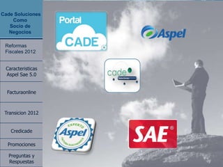 El documento presenta información sobre Cade Soluciones, una empresa que ofrece soluciones tecnológicas. Describe sus servicios de integración de soluciones, socios de negocio, tienda virtual, soporte técnico, facturación electrónica, y el software Aspel SAE 5.0. También incluye secciones sobre las reformas fiscales de 2012 y la transición al nuevo software, así como sobre el portal Facturaonline para el almacenamiento y acceso a facturas electrónicas.