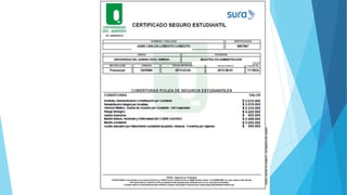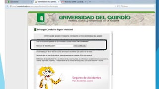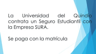 La Universidad del Quindío contrata un seguro estudiantil con coberturas como riesgo biológico, gastos funerarios, muerte accidental, invalidez y atención médica que se paga con la matrícula. El seguro ofrece descuentos como el 10% de la matrícula por votar, estimulos para hijos de servidores públicos y mejores puntajes, y descuentos para familias, deportistas y culturales.