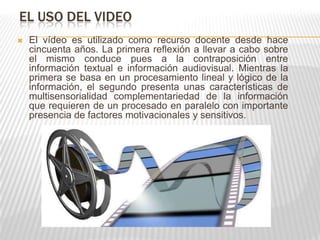 El documento describe el potencial educativo del video y sus funciones didácticas. Explica que el video puede usarse como recurso para enseñar sobre el lenguaje audiovisual, como medio de expresión, para investigación, evaluación e información. También puede usarse para desarrollar las habilidades docentes. El video ofrece una presentación atractiva de contenidos usando múltiples medios y posibilidades de interacción.
