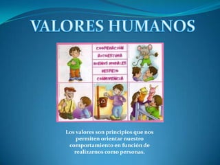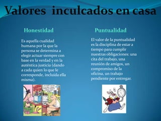 Este documento describe varios valores como la puntualidad, la compasión, la bondad, la oración, la piedad, la lealtad, la generosidad, la humildad, la nobleza, la amistad, la solidaridad y el compañerismo. Define cada valor y explica su importancia para orientar nuestro comportamiento y realizarnos como personas.