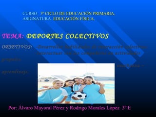Este documento presenta un juego interactivo para que los estudiantes de 3er ciclo de primaria se autoevalúen sobre los deportes colectivos que han estudiado en educación física. El juego consiste en 10 preguntas sobre deportes como baloncesto, voleibol y fútbol sala, con respuestas que guían a la correcta. El objetivo es que los estudiantes interactúen y evalúen de forma dinámica y lúdica sus conocimientos sobre estos deportes.
