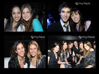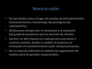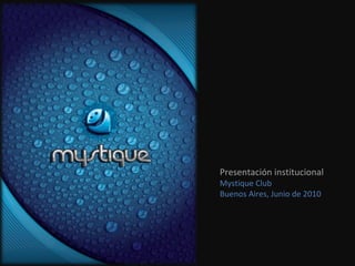 El documento presenta la visión y misión del Mystique Club de Buenos Aires. Su visión es ser percibido como el lugar más prestigioso de Latinoamérica para eventos de entretenimiento, relacionamiento y networking, destacándose por la innovación y excelencia en la atención a clientes. Su misión es proveer a los clientes un espacio de entretenimiento, networking y diversión con altos niveles de calidad.