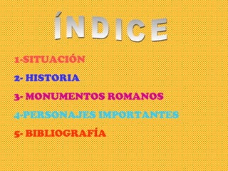 El documento resume la antigua ciudad romana de Lucentum, ubicada en la actual Alicante. Incluye información sobre los orígenes de la ciudad a partir de un asentamiento ibérico, sus principales monumentos romanos como villas y necrópolis, y personajes históricos como Estrabón y Plinio que se refirieron a la región.