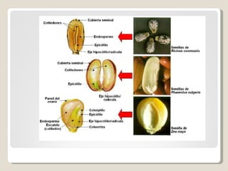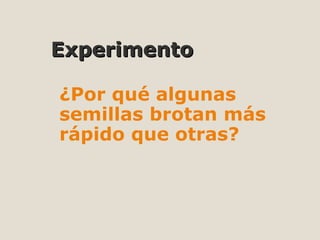 Este documento describe un experimento para determinar qué factores influyen en el crecimiento y germinación de diferentes semillas. Se plantaron porotos, lentejas, trigo y maíz y se observaron durante 4 semanas. Los porotos germinaron primero y crecieron más rápido, mientras que el maíz germinó más lentamente. El trigo tuvo la tasa de germinación más alta. Factores como la cantidad de agua y la ubicación afectaron el desarrollo de las plantas.
