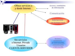 El documento describe los diferentes tipos de servidores, incluyendo servidores web, FTP, correo electrónico, bases de datos, impresión, fax, proxy, telefonía, respaldos y DNS. Cada servidor ofrece servicios específicos como almacenar y distribuir archivos, permitir la colaboración en línea, enrutar llamadas telefónicas, almacenar datos y direcciones IP, y más.