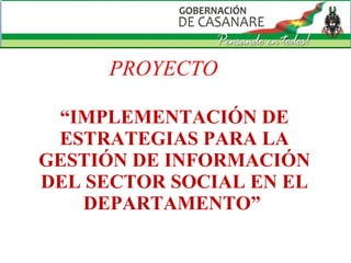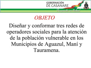 El documento habla sobre la implementación de estrategias para conformar redes de operadores sociales en 3 municipios de Casanare, Colombia, con el fin de mejorar la atención a la población vulnerable y gestionar el desarrollo social a través de la consolidación y el intercambio de información. Las redes buscan articular esfuerzos entre organizaciones para ofrecer soluciones que mejoren las condiciones de vida de las familias casanareñas.