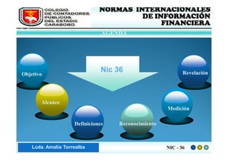 El documento presenta una introducción a la Norma Internacional de Información Financiera (NIC) 36 sobre deterioro del valor de los activos. Explica que la NIC 36 establece los procedimientos para asegurar que los activos se contabilizan por un importe no mayor a su valor recuperable y cubre temas como identificación, medición y reconocimiento de pérdidas por deterioro, así como revelaciones requeridas.