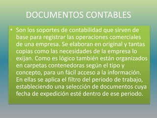 Los documentos y títulos valores son soportes contables y no contables importantes para las empresas. Los soportes contables incluyen documentos como facturas, recibos, cheques y estados de cuenta, los cuales sirven de base para registrar las operaciones comerciales. Los títulos valores son documentos que incorporan créditos u otros derechos como letras de cambio, pagarés y certificados de depósito, los cuales pueden ser transferibles.
