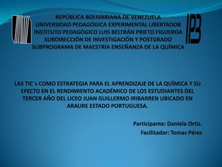 Este documento describe un estudio cuasiexperimental que evaluó el efecto del uso de las TIC (tecnologías de la información y comunicación) en el rendimiento académico de estudiantes de química en un liceo en Venezuela. El estudio encontró que los estudiantes que usaron las TIC como estrategia de aprendizaje mostraron una mejora sustancial en su rendimiento académico en comparación con estudiantes que no usaron las TIC. El estudio concluye que las TIC pueden ser una estrategia efectiva para mejorar el