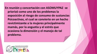 El documento describe un proyecto para prevenir el consumo de sustancias psicoactivas entre madres pertenecientes a la organización ASOMUYPAZ. El proyecto tiene como objetivos identificar los factores de riesgo de consumo, incrementar las capacidades de las mujeres y sus hijos para prevenir el consumo a través de talleres, y promover alternativas de ocio saludable para fortalecer las familias.