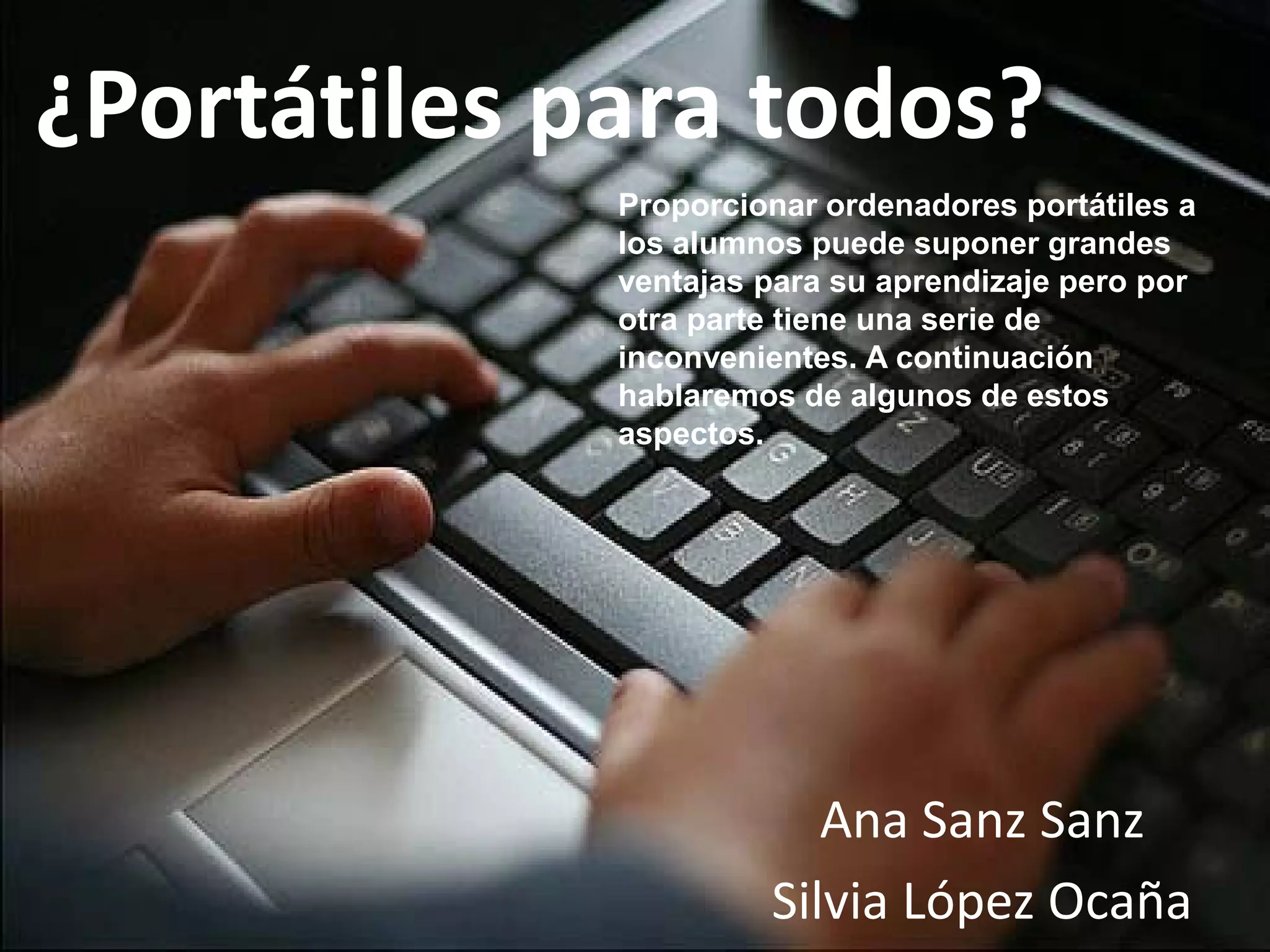 El documento discute las ventajas y desventajas de proporcionar ordenadores portátiles a los estudiantes. Se necesita formar a los profesores para usar efectivamente las nuevas tecnologías, pero también son caros y requieren subvenciones. Los ordenadores deben usarse de forma inteligente para mejorar el aprendizaje, no solo como sustitutos del papel.