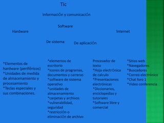 El documento describe los elementos clave de las Tecnologías de la Información y la Comunicación (TIC), incluyendo el hardware, software, e Internet. Explica los componentes de una computadora como el software de sistema y de aplicación, hardware de entrada, salida y almacenamiento, y procesamiento. También detalla elementos del escritorio como iconos de programas, documentos, carpetas, y unidades de almacenamiento, así como barras estándar, formato, estado, inicio y menú.