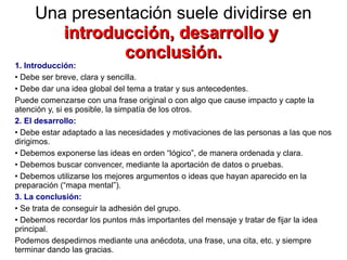 Una presentación suele dividirse en introducción, desarrollo y conclusión. La introducción debe ser breve y captar la atención del público. El desarrollo expone las ideas de forma lógica y ordenada para convencer al público mediante datos y pruebas. La conclusión resume los puntos más importantes para fijar la idea principal y conseguir la adhesión del público.
