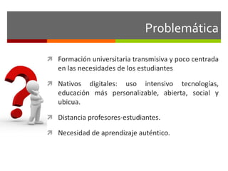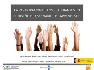 El documento describe un proyecto de investigación que involucra a estudiantes, profesores e investigadores en el co-diseño de escenarios de aprendizaje basados en principios de aprendizaje indagativo y tecnologías educativas. El proyecto busca entender cómo contribuye la voz del estudiante al proceso de co-diseño y qué beneficios obtienen los estudiantes de participar. Los resultados muestran que los procesos de co-diseño promueven la reflexión de los estudiantes sobre sus roles y el aprendizaje,