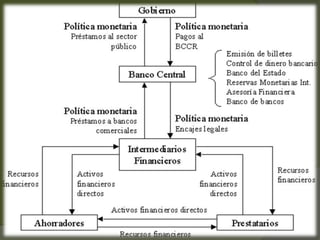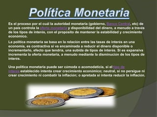 El documento presenta información sobre la política monetaria en el Perú. Explica que el Banco Central de Reserva es responsable de la política monetaria y que su objetivo principal es lograr la meta de inflación establecida entre 1% y 3%. También describe que el Banco Central anuncia una meta anual de inflación para anclar las expectativas de precios del público.