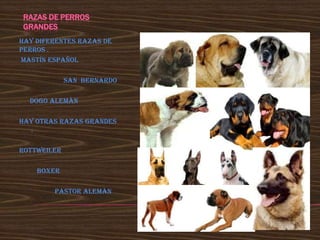 Este documento clasifica las diferentes razas de perros en grandes, medianas y pequeñas. Menciona algunas razas grandes como el Mastín Español, San Bernardo y Dogo Alemán. También describe razas medianas como el Caniche, Dálmata y Chow Chow y razas pequeñas como el Fox Terrier, Carlino y Teckel. Además, explica que los perros domésticos se pueden clasificar como de compañía y menciona algunas razas como el Bulldog Inglés y el Pomerania. Finalmente, señala que tener un