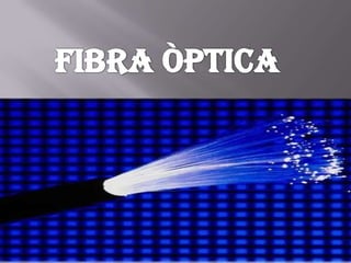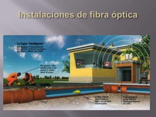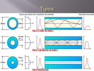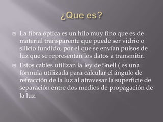 La fibra óptica transmite datos a través de pulsos de luz que viajan por hilos de vidrio o silicio. Utiliza la refracción de la luz para guiar los pulsos a lo largo de la fibra. Puede usarse para redes locales o transmisiones a larga distancia y proporciona una transmisión rápida, continua y de bajo costo en comparación con el cobre.