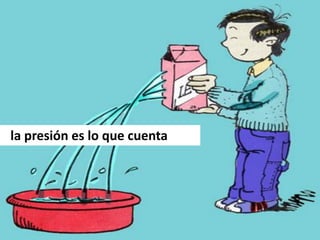Este documento presenta varios experimentos científicos sobre presión, incluyendo la presión hidrostática, la ley de Boyle-Mariotte sobre la relación inversa entre presión y volumen de un gas a temperatura constante, y experimentos como la botella sorpresa, la vela de Filón y la carrera de agua que ilustran estos principios de presión.