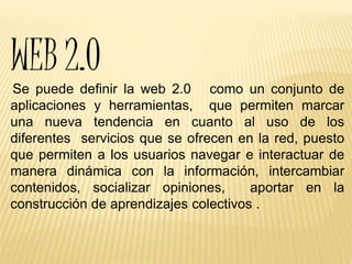 La Web 2.0 permite a los usuarios interactuar de manera dinámica con la información en la red, intercambiar contenidos y opiniones. Se caracteriza por ser una plataforma funcional y simple que permite el flujo de información y contenido entre usuarios. La Web 2.0 ha revolucionado la forma en que las personas usan Internet, pasando de ser solo lectores a productores y compartidores de contenido a través de herramientas como blogs, wikis, redes sociales y entornos para compartir recursos.