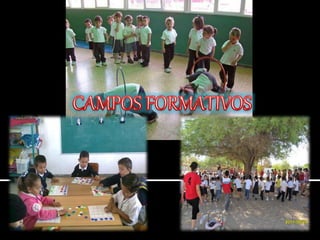 Este documento describe seis campos formativos para el desarrollo integral de los niños en la educación preescolar: lenguaje y comunicación, pensamiento matemático, exploración y conocimiento del mundo, desarrollo físico y salud, desarrollo personal y social, y expresión y apreciación artísticas. Cada campo formativo incluye aspectos específicos que se deben desarrollar en los niños a través de actividades educativas para lograr su integración a la sociedad.