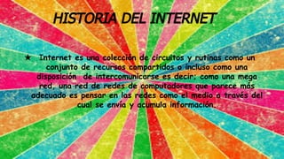 El documento habla sobre la historia de Internet y los tipos de navegadores como Google Chrome, Internet Explorer, Mozilla Firefox y Opera. También define conceptos como WWW, explorador, buscador, link, correo electrónico, dominio y tipos de dominios como genéricos y territoriales.