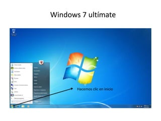 El documento presenta instrucciones para ingresar a Microsoft Power Point en Windows 7 Ultimate. Indica que se debe hacer clic en Inicio, buscar Microsoft Office para encontrar Power Point, y una vez dentro se puede cerrar Power Point.