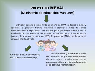 El documento describe los niveles de la escritura según el proyecto MEVAL (Ministerio de Educación-Van Leer) de 1974. Explica que hay 7 niveles que van desde el dibujo y la escritura como una misma cosa hasta la consolidación de la hipótesis alfabética donde cada sonido se corresponde con una letra. También identifica factores que favorecen el aprendizaje como materiales diversos y celebrar logros, versus factores que lo limitan como la pobreza crítica y métodos tradicionales de enseñanza.