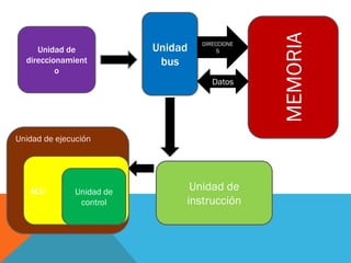 La computadora está compuesta por una unidad central de procesamiento (CPU), que incluye una unidad de control, una unidad de ejecución (ALU) y una unidad de instrucción, una unidad de direccionamiento, una unidad de bus y una memoria para almacenar y recuperar datos para su procesamiento.