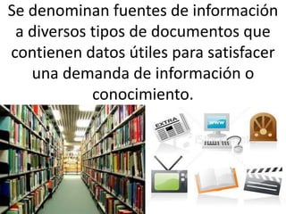 Se denominan fuentes de información a diversos tipos de documentos que contienen datos útiles para satisfacer una demanda de información o conocimiento.
