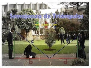 Este documento contiene preguntas y definiciones sobre conceptos geométricos como la semejanza de triángulos, líneas notables en triángulos, relaciones métricas en triángulos rectángulos, los teoremas de Pitágoras y Tales, y una prueba objetiva de matemática con ejercicios. También incluye instrucciones para que los estudiantes trabajen en grupos y discutan sus soluciones.