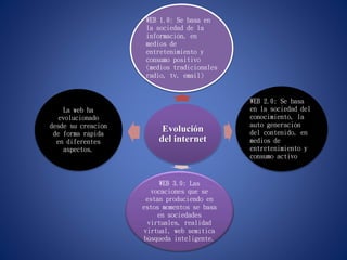El documento describe la evolución de la web desde la Web 1.0 hasta la Web 3.0, enfocándose principalmente en las herramientas de la Web 2.0 como YouTube, Flickr, Google Docs y Blogger, las cuales permiten a los usuarios generar y compartir contenido de forma activa. También menciona otras herramientas útiles como Google Maps, Wikipedia, Animoto y Smilebox que facilitan la búsqueda de información y su distribución a través de diferentes plataformas.