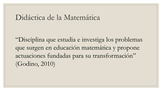 Este documento trata sobre la didáctica de las matemáticas. Explica que la didáctica de las matemáticas estudia e investiga los problemas en la educación matemática y propone soluciones basadas en la evidencia. También discute el trabajo matemático, incluida la creación y reinvención del conocimiento a través de problemas matemáticos, y la institucionalización del trabajo matemático a través de varios problemas.