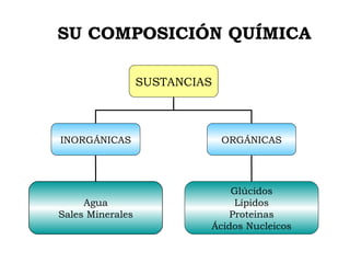 Los seres vivos nacen y mueren, tienen una composición química similar y están formados por células. Realizan funciones vitales como nutrición, relación y reproducción, y están compuestos por sustancias orgánicas e inorgánicas. La vida depende de factores como el agua en tres estados, temperatura adecuada, oxígeno y el campo magnético.