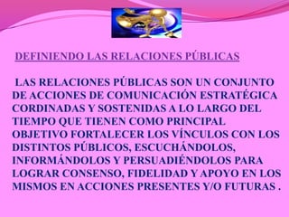 El documento define las relaciones públicas y explica sus objetivos de fortalecer los vínculos con los públicos a través de la escucha, información y persuasión. También describe cómo las relaciones públicas usan técnicas de negociación, marketing y publicidad para complementar su labor en el entorno social. Finalmente, resume los diferentes modelos de relaciones públicas a través de la historia, desde el modelo del agente de prensa unidireccional hasta el modelo de doble flujo simétrico bidireccional que busca la comprensión mutua.