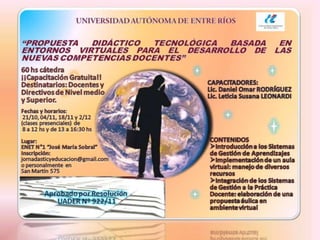 El documento aborda la implementación de la educación virtual en la plataforma Moodle de UADER, destacando la necesidad de capacitar a docentes en metodologías y gestión de plataformas educativas. Se enfatiza la importancia del diseño instruccional y el uso de herramientas de la web 2.0 para enriquecer el aprendizaje en entornos virtuales. Además, se plantea el aprendizaje como un proceso social y colaborativo que implica la interacción constante entre los individuos y las fuentes de conocimiento.