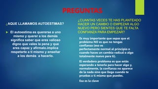 Este documento trata sobre la autoestima y la confianza. Define la autoestima como quererse a uno mismo y valorarse positivamente. Explica que la autoestima puede ser baja o alta y tiene componentes cognitivos, afectivos y conductuales. Además, señala que la confianza es fundamental para el desarrollo personal y que aunque es difícil confiar después de ser traicionado, se puede mejorar la confianza en los demás estableciendo vínculos personales y laborales basados en la credibilidad y seguridad.