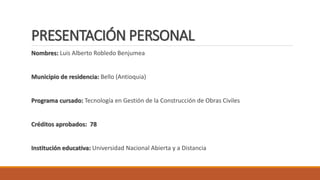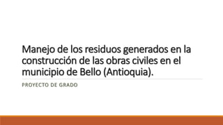 Este documento presenta el proyecto de grado de Luis Alberto Robledo Benjumea sobre el manejo de los residuos generados en la construcción de obras civiles en Bello, Antioquia. El proyecto busca formular un modelo de gestión para los residuos desde la planificación de los proyectos basado en las etapas de generación, clasificación, almacenamiento, tratamiento y disposición final. El documento incluye la presentación personal de Luis, la justificación, objetivos, marco teórico y legal del proyecto, así como las fu