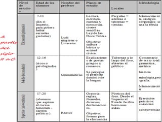 El documento describe aspectos de la familia, educación y ocio en la sociedad romana. Los romanos daban nombres a los hijos el octavo o noveno día tras el nacimiento y estos nombres reflejaban sus antepasados. Los niños jugaban a representar batallas o juegos de mesa mientras que las niñas jugaban con muñecas y vajillas. Los romanos practicaban la adopción para introducir extraños como hijos. En su ocio disfrutaban de espectáculos en el circo o teatro, y de baños públicos