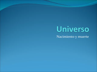 El documento habla sobre el nacimiento y muerte del universo. Explica que el universo nació hace 14 mil millones de años según nuevos cálculos y que la teoría del Big Bang trata de explicar su origen. También menciona la teoría de la muerte térmica del universo propuesta por el científico James Jeans y la predicción maya sobre el fin de la civilización humana el 21 de diciembre de 2012.