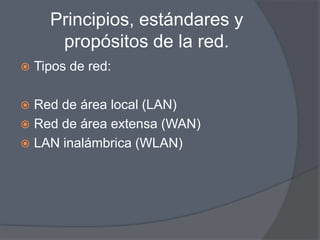 El documento describe los principios básicos de las redes, incluidos los tipos de redes como LAN, WAN y WLAN. También describe los componentes clave de una red como hosts, periféricos y dispositivos de red, así como las conexiones entre dispositivos, protocolos e IP.