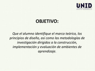 Este documento presenta un curso sobre la creación de ambientes de aprendizaje. El objetivo del curso es que los estudiantes identifiquen el marco teórico, los principios de diseño y las metodologías de investigación para construir, implementar y evaluar ambientes de aprendizaje. El curso cubre temas como la planificación, diseño, objetos de aprendizaje, usabilidad y comunicación e interacción. Los estudiantes serán evaluados a través de su participación en clase, un portafolio de evidencias, una investigación
