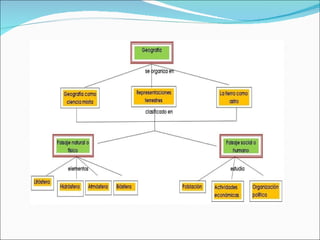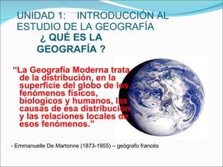 El documento introduce los conceptos fundamentales de la geografía. La geografía estudia la distribución en la superficie terrestre de los fenómenos físicos, biológicos y humanos, así como las causas de esta distribución y las relaciones entre dichos fenómenos. La geografía es una ciencia mixta que integra aspectos de las ciencias naturales y sociales para comprender las interacciones entre el medio ambiente y la sociedad humana.