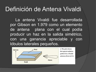 La antena Vivaldi fue desarrollada en 1979 por Gibson. Consiste en un metal con una ranura que varía exponencialmente de ancho, normalmente sobre un sustrato dieléctrico. Solo una parte de la exponencial es eficientemente radiante para una longitud de onda dada, lo que le da un ancho de banda teóricamente infinito. Tiene alta directividad y puede producir patrones simétricos de radiación. Se usa comúnmente en aplicaciones como sistemas de radar y comunicaciones por satélite y telefonía móvil.