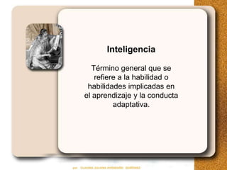 La inteligencia se refiere a las habilidades implicadas en el aprendizaje y la conducta adaptativa. Existen teorías que argumentan que la inteligencia está compuesta por una habilidad general o por muchas habilidades separadas. Las teorías contemporáneas incluyen la teoría triárquica, las inteligencias múltiples y la inteligencia emocional. La herencia y el ambiente influyen en la inteligencia de una persona.