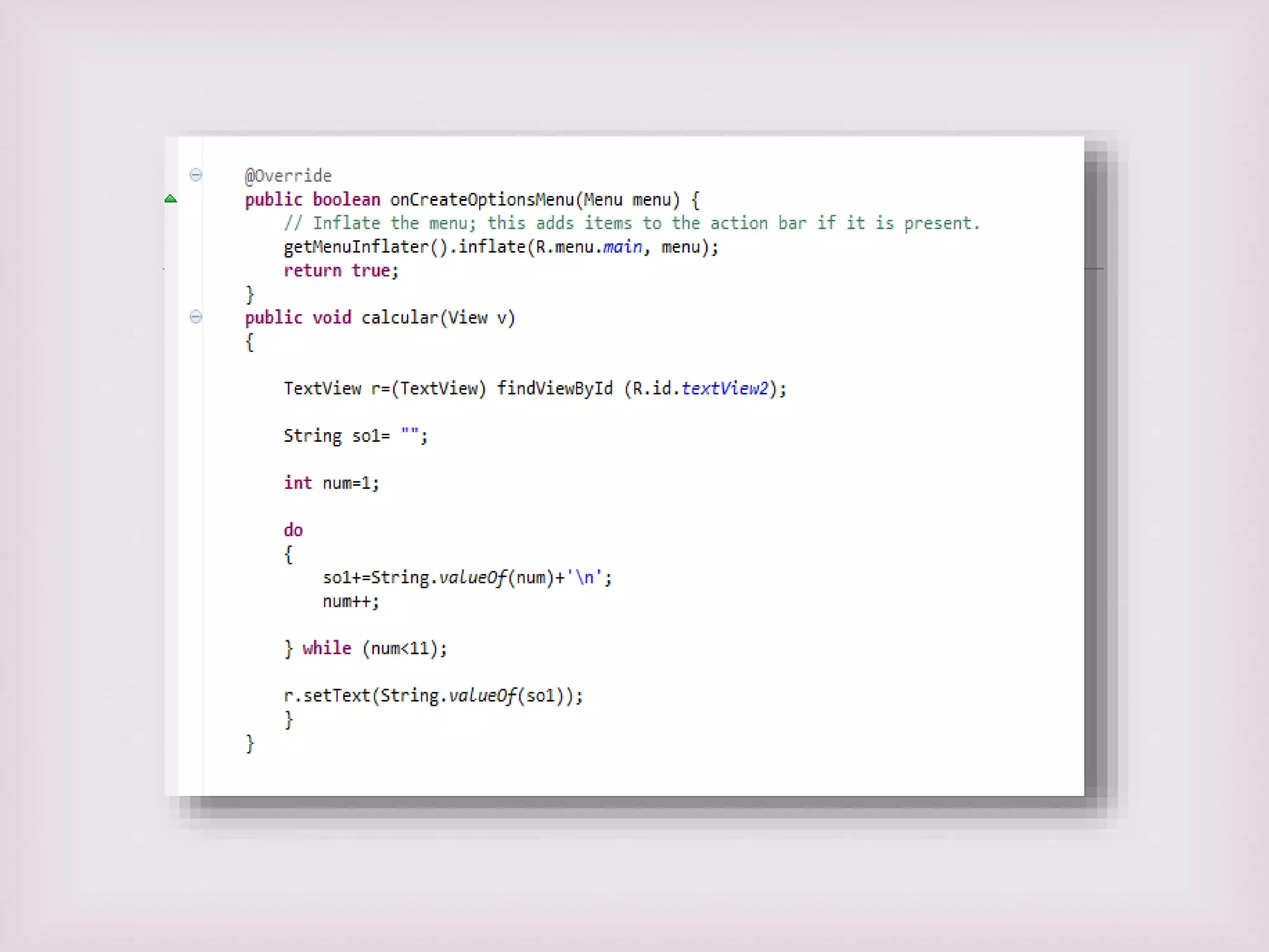 Este documento describe un programa que imprime los números del 1 al 10 al presionar un botón. Incluye instrucciones para agregar un TextView, un botón y un área de texto a la plantilla, y cómo el código debería funcionar para mostrar la secuencia numérica al hacer clic.